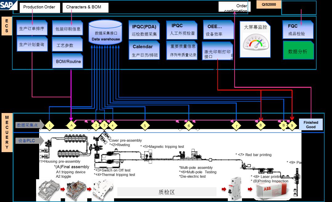 在整个信息管理系统中,制造执行系统(MES)的应用,是ABB北京工厂在智能化制造的实践中迈出的一大步.MES系统的基本功能包括:设备效率控制、质量控制、设备工艺参数 自动设置、生产计划排程、可视化管理、数据追踪、设备故障实时报警、管理层报告等.生产订单及产品参数等信息通过MES系统传输到自动化生产线上,同时在生产线上也有大量的自动数据采集点,实时的把这些海量数据反馈给MES信息进行各种监控、跟踪和分析,由此可对整个制造过程和业务管理流程进行快速及有效的改进.